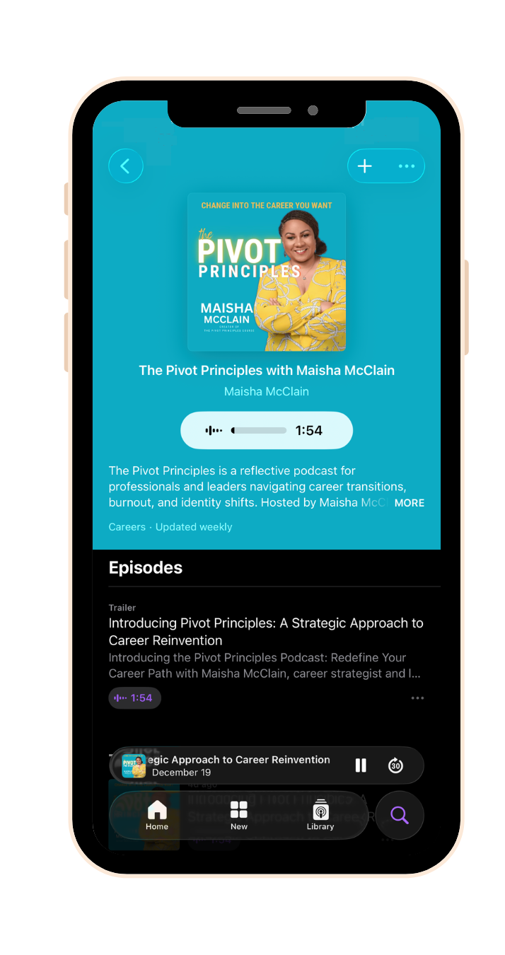 The Pivot Principles is my podcast for navigating career transitions, burnout, and identity shifts. In each episode, I share grounded insights, practical frameworks, and thoughtful conversations to help you reassess your direction, rebuild clarity, and move forward with intention.